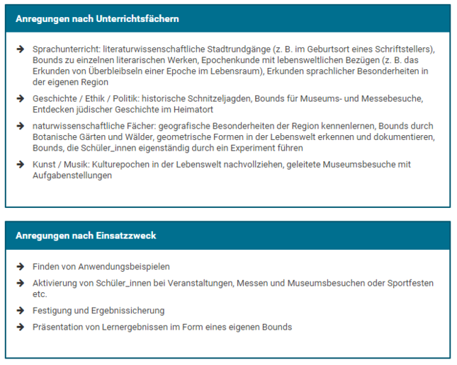 Actionbound eignet sich besonders für kreativorientierte, geschichtlich-politische als auch naturwissenschaftliche Fächer. Die Möglichkeiten sind aufgrund der inhaltlichen Freiheiten, die durch die Struktur der Bounds gegeben sind, nahezu grenzenlos. Fast jedes beliebige Thema kann so schülerzentriert und aktivierend bearbeitet werden. Die Einbindung in einen sozialräumlichen Kontext unterstützt diese Aspekte zusätzlich. Naheliegend sind beispielsweise historische Bounds zur Erkundung der eigenen Geschichte des Schulortes oder geografische Bounds. Aber auch Bounds zur Erkundung kulturhistorischer Orte und zur Epochenkunde im Kunstunterricht sind möglich. Besonders spannend können mit der App Exkursionen – angefangen bei einem Wandertag, einer Klassenfahrt bis hin zu einem Besuch in öffentlichen Einrichtungen – gestaltet werden. Eine Messe oder eine Informationsveranstaltung im Berufsinformationscenter können so beispielsweise medial ergänzt und dokumentiert werden. Durch die Möglichkeit, neben Einzel-Bounds auch solche für ganze Gruppen zu erstellen, lässt sich das jeweilige Setting den Bedürfnissen der Schüler_innen, aber auch den Rahmenbedingungen vor Ort anpassen. Interessant bezüglich eines Peer-to-Peer und sogar intergenerativen Lernens wird es, wenn Schüler_innen selbst Bounds erstellen, die von jüngeren Schüler_innen oder Lehrer_innen und Eltern durchgeführt werden.