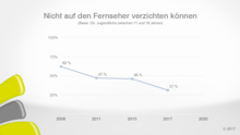 Die Bedeutung des guten alten Fernsehgeräts nimmt mehr und mehr ab! Konnten im Jahr 2008 62 % der befragten Jugendlichen nicht darauf verzichten, waren es 2011 und 2015 nur noch 47 % bzw. 46 % und aktuell nur noch 31 %.