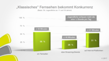 Die Konkurrenten sind Streaming-Dienste und Internetvideos. 56 % sehen mehr als eine halbe Stunde fern pro Tag, 28 % nutzen einen Streamingdienst mehr als eine halbe Stunde täglich und gar 51 % sehen sich Kurzvideos im Internet an, bevorzugt auf YouTube.