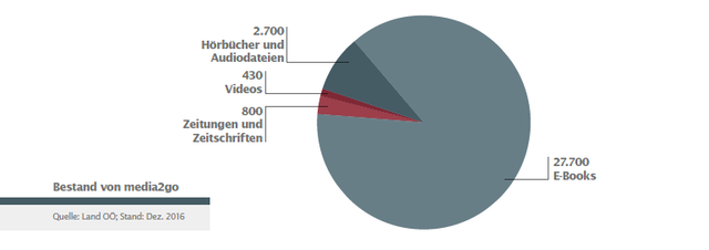 media2go, das Angebot der Digitalen Bibliothek OÖ im Internet, wurde 2016 ca. 225.000 Mal genutzt: Es fasst die digitalen Bestände der Stadtbibliothek Linz und des Landes OÖ zu einem Gesamtangebot zusammen und ermöglicht allen Kund/innen der rund 180 teilnehmenden öffentlichen Bibliotheken, auf einfache Art und Weise digitale Medien auszuleihen.