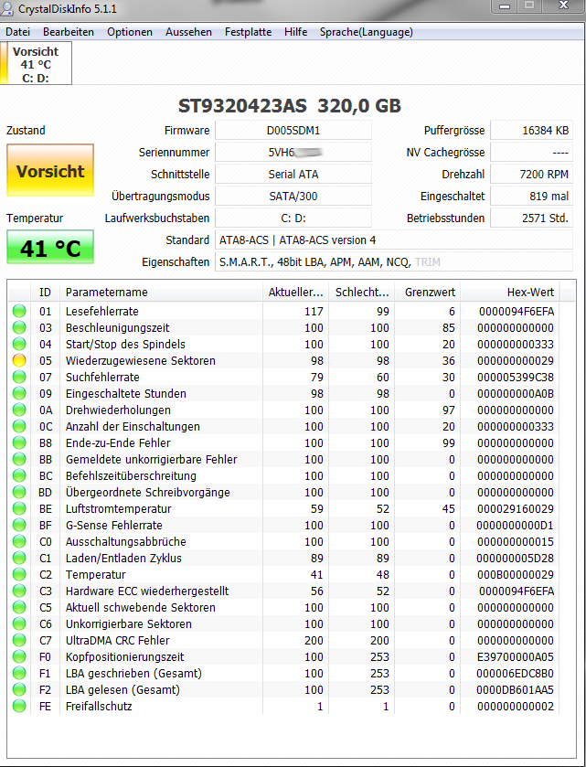 Es sei an dieser Stelle darauf hingewiesen, dass man diese Werte immer richtig interpretieren muss. Zum einen ist es so, dass S.M.A.R.T. keine allgemein gültigen Standardwerte definiert, sondern jeder Festplattenhersteller selber angeben kann, was ein Problem darstellt und was nicht. Nimmt man beispielsweise den problematischen Wert aus dem Screenshot, heißt das nicht zwingend, dass die Festplatte kurz vor dem Exodus steht. Wenn sich dieser Wert im Laufe der fast 2.600 Stunden hin und wieder mal erhöht, ist das kein eindeutiges Alarmsignal. Geht es aber innerhalb kurzer Zeit sprunghaft hoch, ist Vorsicht angebracht.