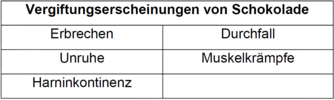 8. Ändere „Die letale Dosis beträgt 100 mg Theobromin/kg        Körpergewicht, bereits geringere Mengen führen aber zu Vergiftungserscheinungen, die sich in Erbrechen, Durchfall, Unruhe, Muskelkrämpfen und Harninkontinenz äußern können.“ um auf: „Die letale Dosis beträgt 100 mg Theobromin/kg Körpergewicht, bereits geringere Mengen führen aber zu Vergiftungserscheinungen.