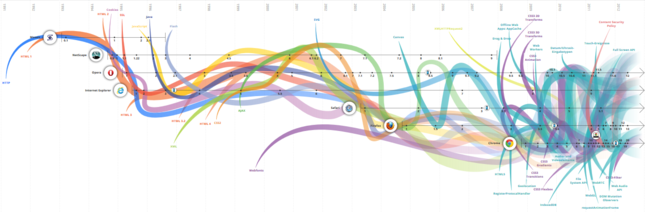 Die farbigen Bänder in dieser Darstellung veranschaulichen die Interaktionen zwischen Webtechnologien und Browsern, die die Grundlage für die zahlreichen täglich von uns verwendeten leistungsstarken Web-Apps bilden.