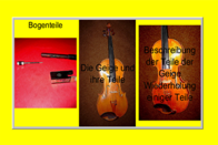Mit Hilfe von 15 Übungen lernen die Kinder die Teile der Geige und des Bogens kennen. Zwei kleine Diashows beleben die Übungen. Zwei Texte gehen noch näher auf den Bau der Geige ein.