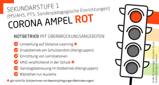 Wir haben als besonderes Service für Sie speziell für die Sekundarstufe I Infografiken erstellt, die auf einen Blick die jeweiligen Maßnahmen für die einzelnen Farben für die Sekundarstufe I (MS/AHS, PTS, Sonderpädagogische Einrichtungen) übersichtlich darstellen.