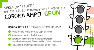 Die Corona-Ampel dient dazu, schnell und regional auf eine steigende Infektionszahl zu reagieren. Das Bildungsministerium hat für jede der 4 Ampelfarben Maßnahmen für die einzelnen Schultypen definiert, um SchülerInnen und Lehrkräfte zu schützen.
