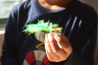 ...einen Zahnbürstenkopf, ein 3D-Print-Gehäuse, einen Vibrationsmotor und eine Knopfbatterie, stecke die Bauteile ohne Kleben und Löten ineinander und verziere das "Tier" dann noch mit Deko-Elementen wie zum Beispiel bunten Pfeifenputzern, Klebeaugen, Federn, Perlen oder Plüschkugeln.