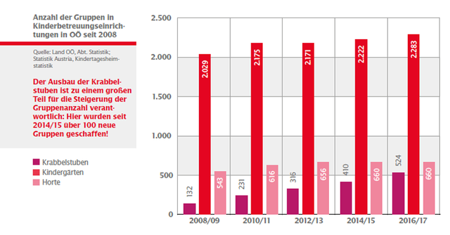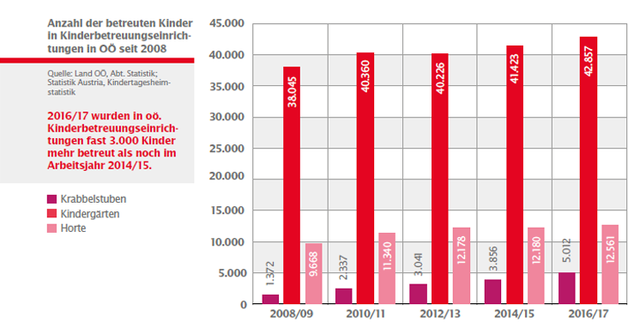 Im Arbeitsjahr 2015/16 besuchten fast 59.000 Kinder eine Kinderbetreuungseinrichtung in Oberösterreich. Die Kinderbetreuung erfolgte in insgesamt 3.372 Gruppen – insgesamt konnte im Vergleich mit dem Arbeitsjahr 2014/15 hier eine Steigerung um 80 Gruppen verzeichnet werden.