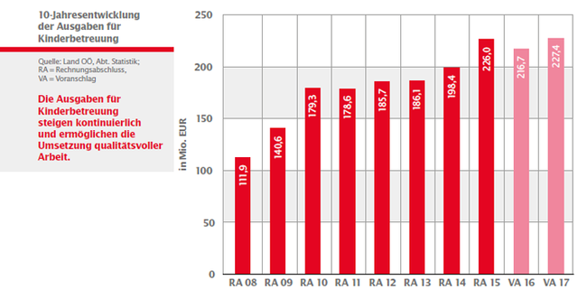 Insgesamt wurden durch das Bildungsressort des Landes OÖ 2016 mehr als 216,7 Mio. Euro im Bereich der Kinderbetreuung investiert. Verwendet wurden die Aufwendungen für Gruppenförderung, Kindergartentransport, Sprachförderung, Fachberatung für Integration sowie Investitionsbeiträge an Gemeinden und private Rechtsträger: