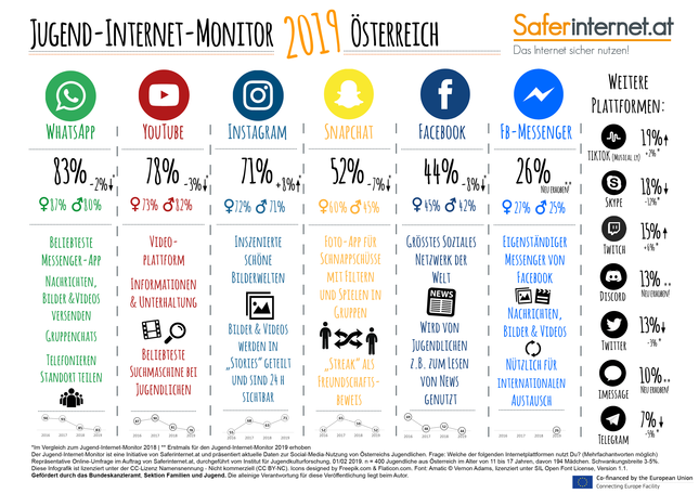 Saferinternet.at präsentiert auch 2019 wieder die aktuellen Daten zur Social-Media-Nutzung der österreichischen Jugendlichen. Welche Netzwerke liegen voran, welche haben an Bedeutung verloren und welche haben es erstmals ins Ranking geschafft?