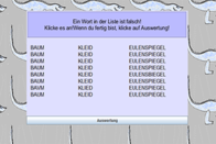 In einer Spalte stehen lauter gleiche Wörter untereinander, nur 1 Fehler hat sich eingeschlichen. Dieses falsche Wort ist anzuklicken.
