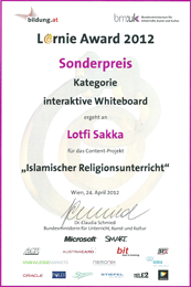 Eine Prämierung mit dem Lörnie-Sonderpreis gab es dieses Jahr für das "Active Board", eine "Einführung in Wort und Bild in den islamischen Religionsunterricht", speziell aufbereitet für interaktive Tafeln. Wir gratulieren Lotfi Sakka!