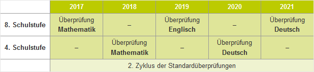 Mit dem Schuljahr 2016/17 hat der neue Zyklus der Standardüberprüfungen begonnen. Jährlich findet entweder auf der 4. oder 8. Schulstufe eine fachspezifische Überprüfung der Bildungsstandards statt. Die zeitliche Abfolge gestaltet sich dabei folgendermaßen: