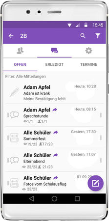 Der Lehrer legt eine virtuelle Klasse an und lädt die Eltern seiner Schüler ein beizutreten. Via Smartphone-App oder Webapp kann die übersichtliche Form der Klassenkommunikation dann sofort starten.