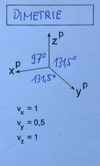 Laut ÖNORM soll die Verzerrung der y-Achse bei (vereinfachter) Dimetrie 0,5 sein, x- und z-Achse sind unverzerrt dargestellt.