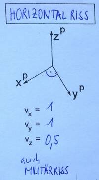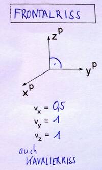 Laut ÖNORM sollte der Winkel zwischen xP und yP 45° und die Verzerrung der x-Achse 0,5 betragen. Da Normen keine verbindlichen Gesetz darstellen, können diese Werte beim praktischen Zeichnen auch verändert sein.