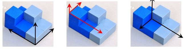 Schritt 1: zuerst "Hauptrichtungen" (möglichst jeweils normal zueinander) am Objekt sucht, dann ein Raumkoordinatensystem in diese Hauptrichtungen legt. Vergleiche dazu die beiden Bildleisten unterhalb!