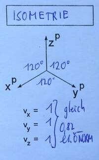 Sind etwa alle drei Winkel gleich (120°), so spricht man von einer isometrischen Darstellung oder kurz "Isometrie" (iso... gleich).