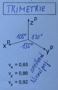 Laut ÖNORM sollte der Winkel zwischen xP und zP 120° und die Verzerrung der z-Achse 0,5 betragen. Da Normen keine verbindlichen Gesetz darstellen, können diese Werte beim praktischen Zeichnen auch verändert sein.