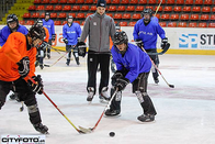 Die 12 Lehrlingshelden wurden in Gruppen aufgeteilt um diverse Übungen zu absolvieren. Abbremsen bei voller Fahrt vor der Bande, Sprints über das Spielfeld und Geschicklichkeitsübungen mit dem Puck - das Training ließ die Jugendlichen ganz schön ins Schwitzen kommen.