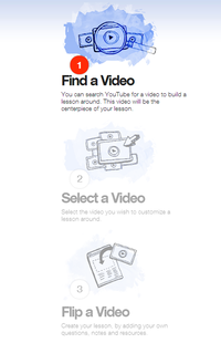 Nach dem Login öffnet sich mit einem Klick auf „Create a Lesson“ ein Suchfenster, in das man den Suchbegriff für das gewünschte YouTube Video eingibt, worauf YouTube-Filme zur Auswahl vorgeschlagen werden. Der erste Schritt heißt also „Find a video“. Der zweite „Select a video“. Mit „Flip This Video“ wird die Auswahl abgeschlossen. Natürlich lassen sich neben YouTube alle Filme von TED.com ebenso verwenden.