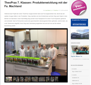"Während das Projekt der einen TheoPrax Gruppe bereits Hand und Fuß angenommen hat, steckt das der zweiten Gruppe mitten in der Produktion. Dazu machten sich die Schülerinnen auf den Weg nach Naarn in den Betrieb von Machland. Einen Nachmittag lang wurden neue Rezepturen für einen Frucht-Squeezer gemischt und verkostet. Nach elf Versuchen wurde eine geschmacklich überzeugende Mixtur gefunden, welche dann, als erste Testversion abgefüllt, ihren Weg nach Dachsberg angetreten hat und dort nun auf die weitere Bearbeitung wartet."