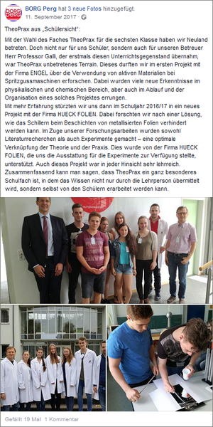 Das BORG Perg gab auf seiner Facebook-Seite im September 2017 Einblicke in die Welt von TheoPrax aus Schülersicht.