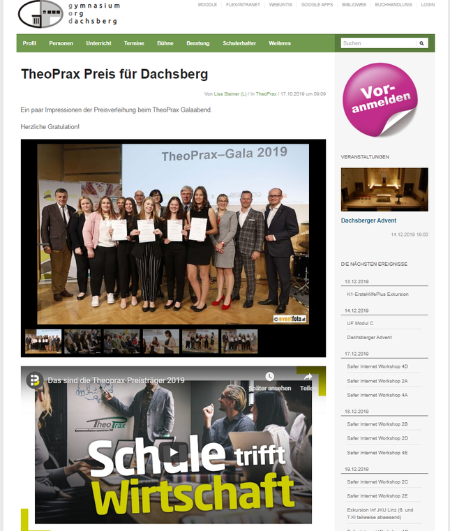Im Oktober 2019 ging einer der TheoPrax-Preise an eine Gruppe des Gymnasiums Dachsberg. Auf der Schulhomepage wurde über diesen Erfolg berichtet.