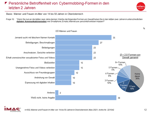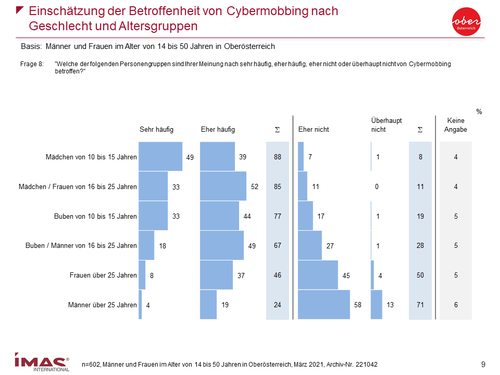 Das Institut für Markt- und Sozialanalysen (IMAS) hat im Auftrag des Landes OÖ eine Umfrage zu Cybermobbing durchgeführt. Befragt wurden 602 Männer und Frauen zw. 14 und 50 Jahren in Oberösterreich. Die Schwerpunkte der Befragung lagen auf Informationsstand, Betroffenheit und Arten von Cybermobbing.