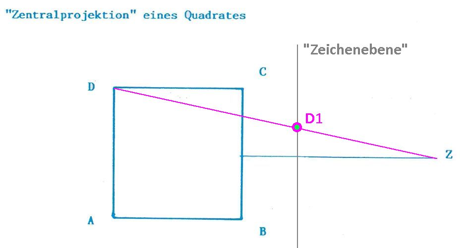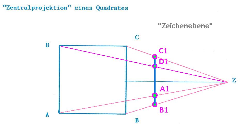 Aufgabe 1: Das Quadrat soll aus dem Punkt Z aus betrachtet werden oder anders gesprochen: Projiziere das Quadrat aus dem Punkt Z auf eine Gerade, die hier "Zeichenebene" genannt worden ist, obwohl es ja nur eine Gerade ist.