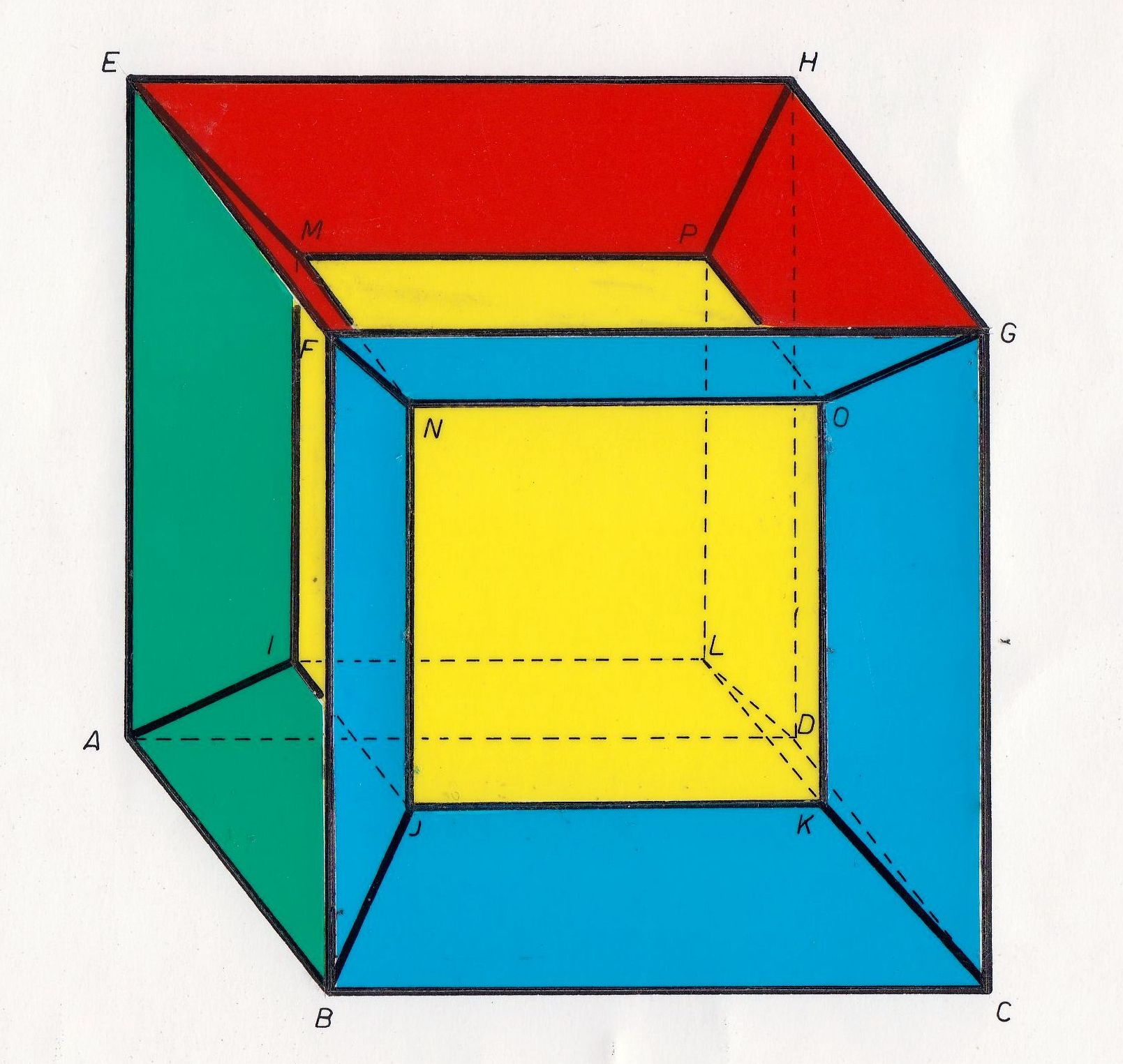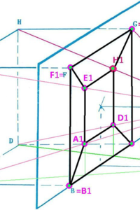Analyse des Bildes: Das Würfelbild besteht also aus 8 Eckpunkten A1,B1,C1, ... Die Zentralprojektion erscheint etwas verzerrt. Aber ich denke, du erkennst, dass das Zentralbild des R3-Würfels aus zwei ineinander verschachtelten Quadraten besteht: Wenn man genau hinsieht, dann erkennt man die Bilder aller 6 Seitenflächenquadrate: Das Quadrat ADHE wird auf das kleine Quadrat A1,D1,H1,E1 abgebildet. Das Quadrat BCGF bleibt unverändert, da es in der Bildebene liegt. Die vier anderen Quadrate werden durch die Zentralprojektion verzerrt und sind im Bild Trapeze.