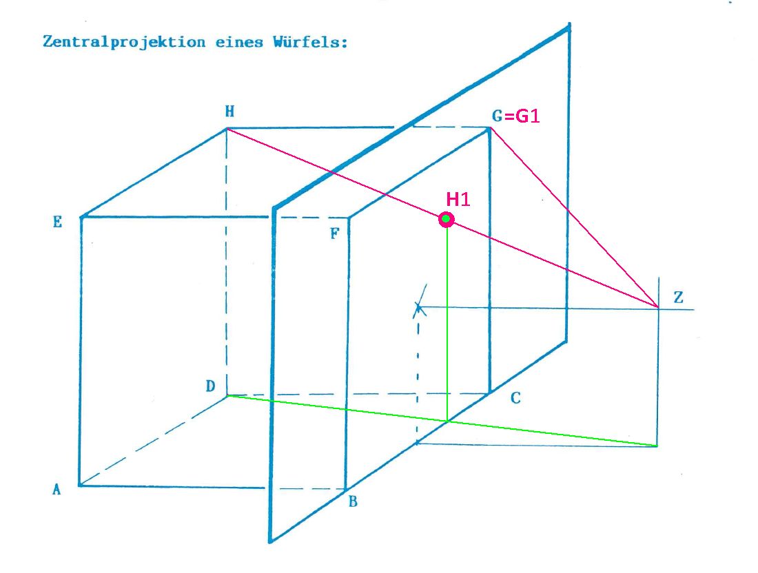 Aufgabe 2: Konstruiere nun die Zentralprojektion des Würfels ABCD EFGH aus dem Punkt Z auf die eingetragene Ebene. Ein Lösungsanregung findest du im Bild rechts.