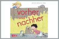 Das Pappbilderbuch "vorher und nachher" von Doris und Johanna Rübel enthält zahlreiche dieser Zwei-Bilder-Geschichten und lädt die jungen BetrachterInnen dazu ein, zu grübeln, was danach passieren könnte. Jedes Mal gibt es ein Vorher und ein Nachher, doch vielleicht ist es nicht immer wie erwartet? Das macht das Umblättern richtig spannend.