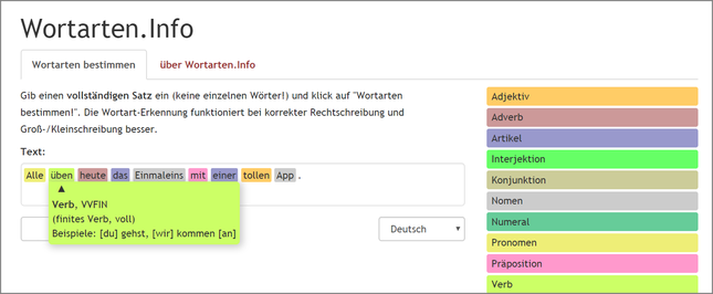 Die Wortarten richtig zu bestimmen ist manchmal gar nicht so leicht. Wenn man unsicher ist, kann vielleicht dieses kleine Web-Tool weiterhelfen. Es bestimmt automatisch die Wortarten der eingegebenen Sätze.