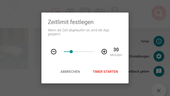 - Timer: ermöglicht das Beschränken der Zeitdauer, wie lange Kinder in der App surfen dürfen - dies ist in einer Zeitspanne von einer Minute bis zu zwei Stunden möglich. Startet der Timer, ist oben in der App ein dünner Balken sichtbar, in dem die abgelaufene bzw. die bestehende Zeit angezeigt wird (Sanduhr-Prinzip). Wenn die Zeit abgelaufen ist, wird die App gesperrt und es erscheint auf dem Display eine niedliche, simple Kreatur, die sich schlafen legt. (Hinweis: Austricksen funktioniert hier nicht: Verlässt man die App und startet diese dann erneut, wird abermals die schlafengelegte Karikatur angezeigt. Erst Erwachsene können dann - mittels Eingabe des Codes - den Timer beenden und YouTube Kids wieder für die Kinder freigeben).